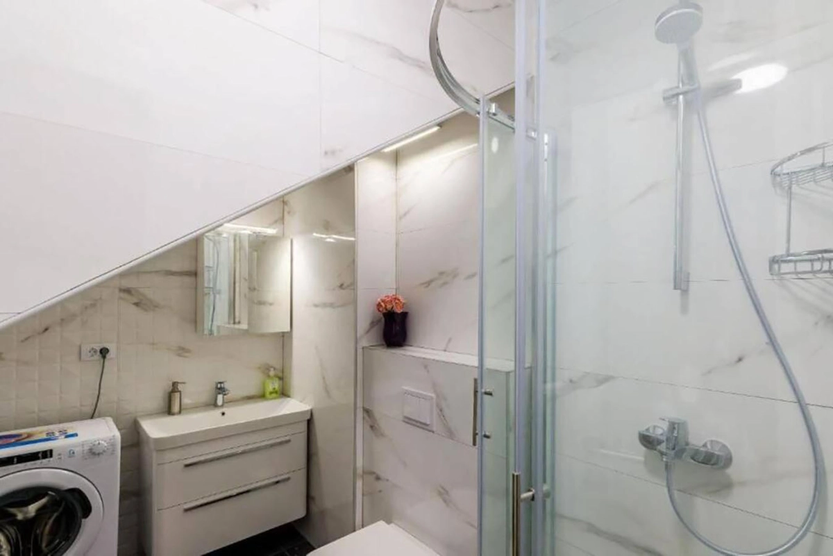 The apartment features all modern amenities including a flat-screen TV with cable channels, a fully equipped kitchen with a dishwasher, microwave and washing machine and a bathroom with a shower. Both the living room and bedroom have an air conditioning unit.